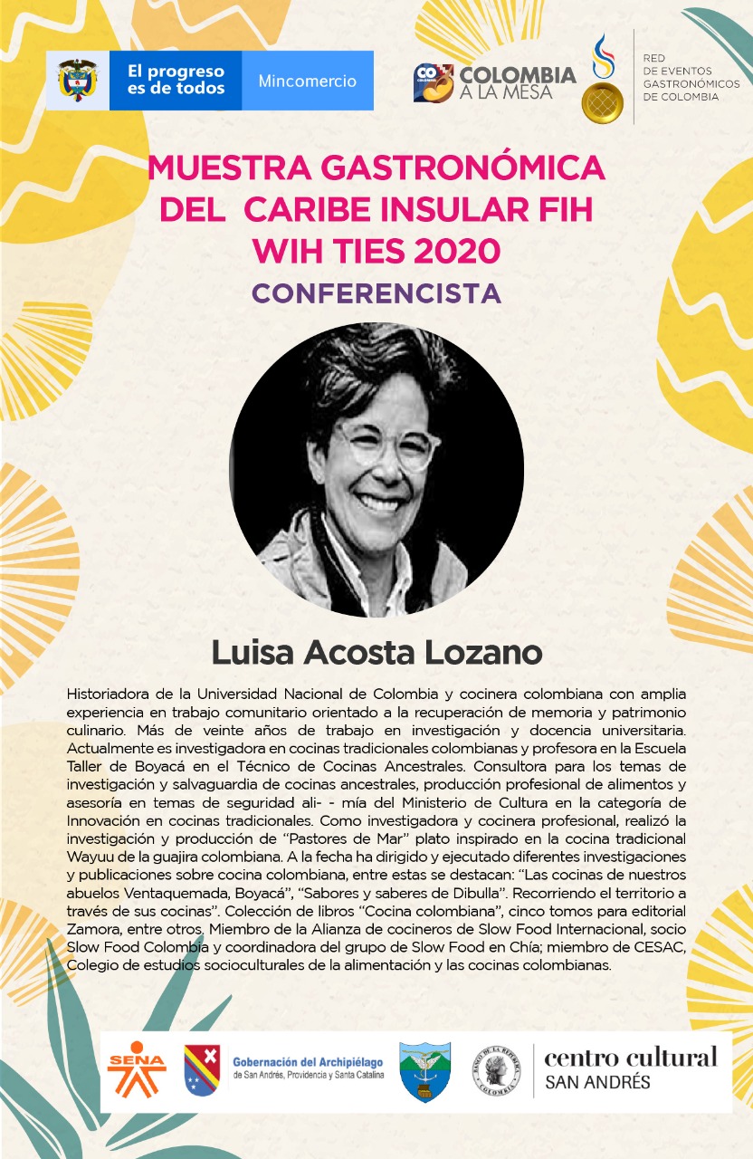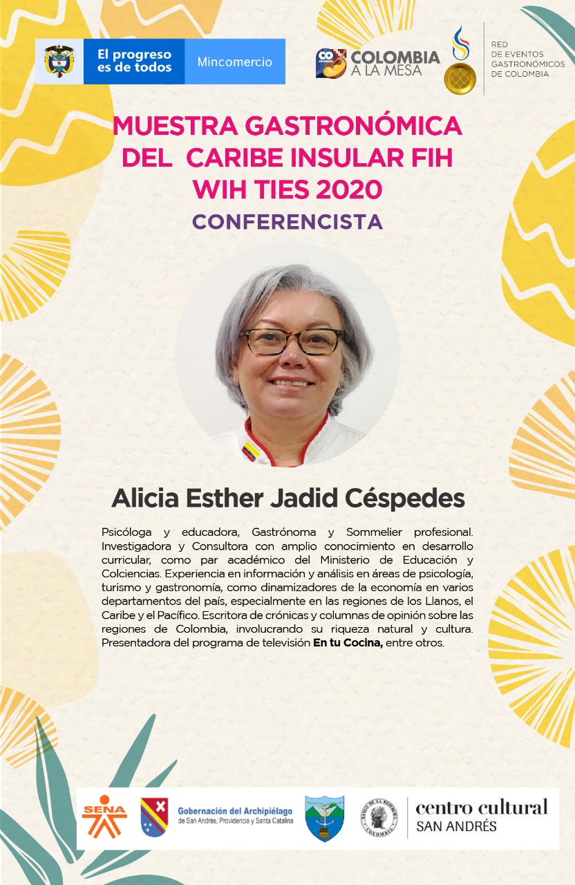 María Hall, cocinera tradicional de San Andrés, propietaria del Restaurante Miss Bess Rincón de la Guacamaya, preparará su plato conocido como Stew Boil, mientras que Alicia Jadid, psicóloga y gastrónoma cartagenera, centrará su participación sobre el papel de las bebidas ancestrales en la identidad gastronómica.