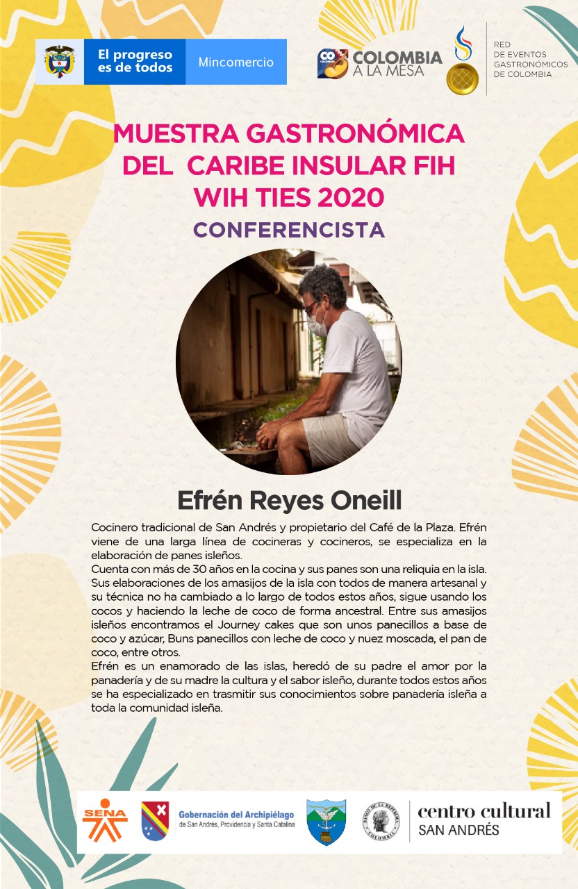 El viernes 28 de agosto continúa la agenda con los shows de cocina a cargo de diferentes representantes de la gastronomía isleña. Para esta parte del programa se cuenta con la presencia de Efrén Reyes Oneill, cocinero tradicional de San Andrés y propietario del Café de la Plaza. Él presentará la elaboración de un pan tradicional isleño.