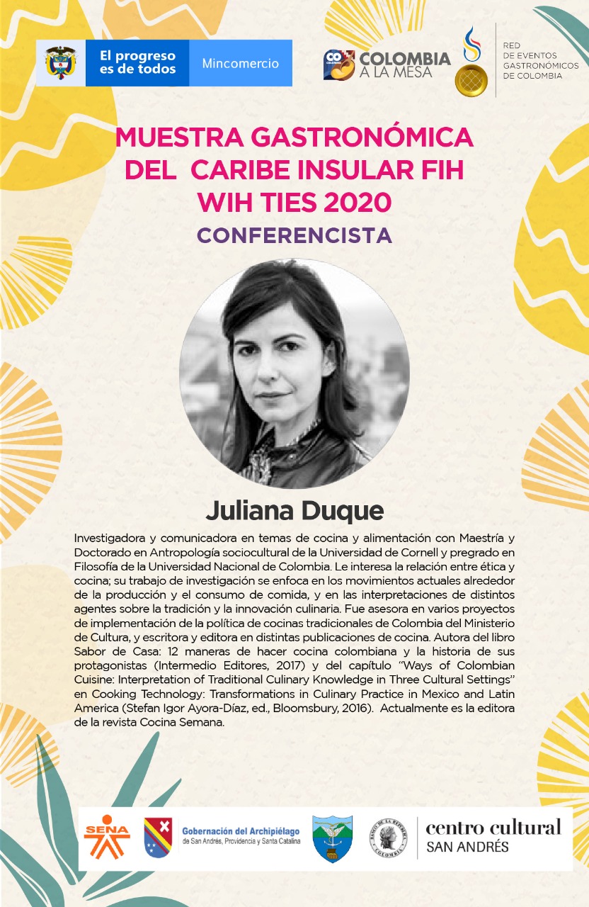 Las presentaciones del 27 de agosto termina con la intervención de Juliana Duque, investigadora y comunicadora en temas de cocina y alimentación y quien dará una charla sobre la repostería en la cocina del Caribe.