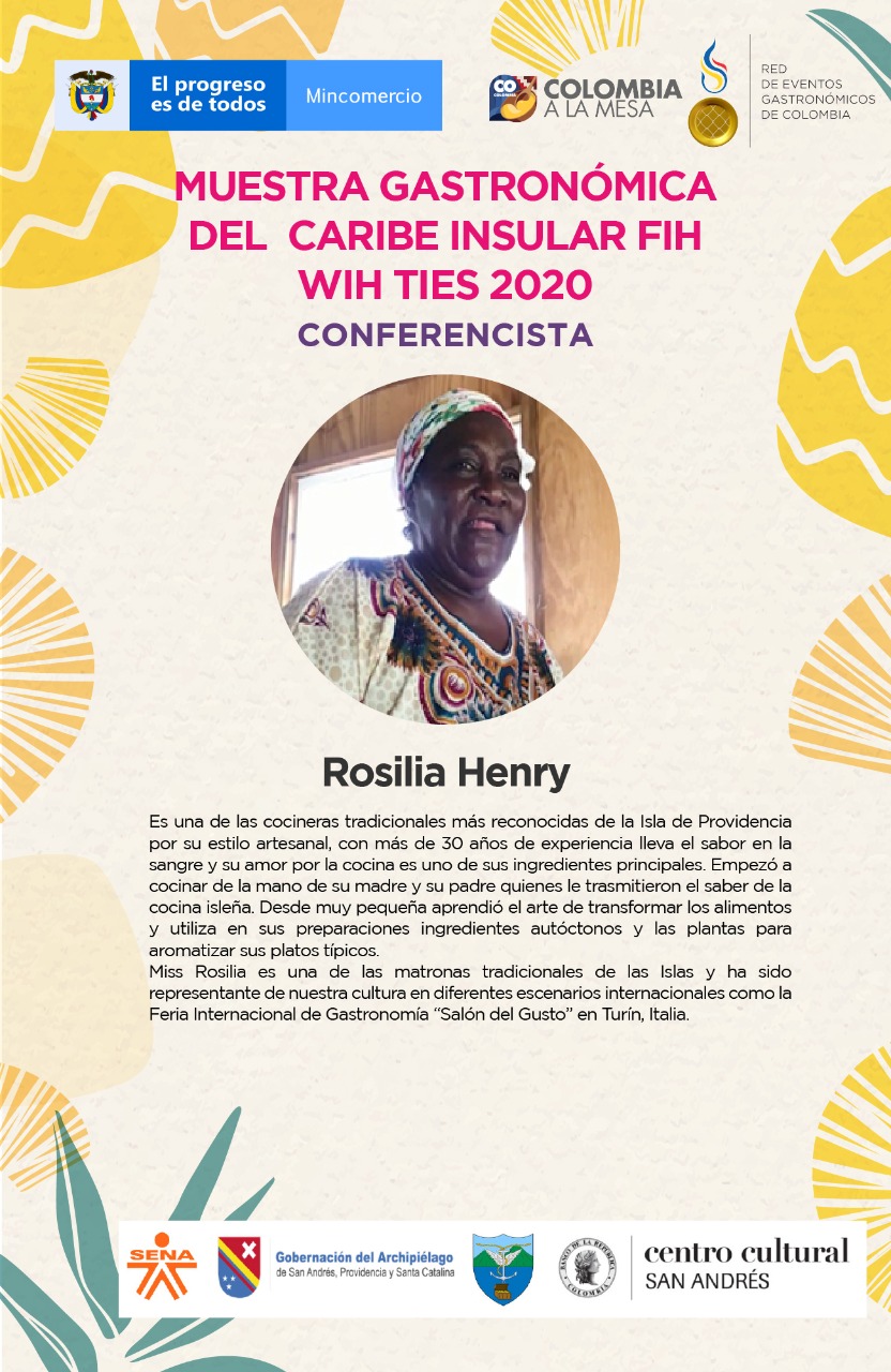 Rosilia Henry, cocinera tradicional de la Isla de Providencia, se hace presente con un plato típico Isleño Stew Pork o cerdo guisado con fruta de pan. Por su parte Lancelot Forbes, uno de los chefs isleños más reconocidos por sus preparaciones en el fogón de su patio, ilustrará sobre los platos del hombre en la cocina isleña a través del Stew Bean and Pig Tail.